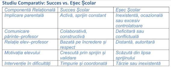 Pentru a înțelege mai bine impactul relației părinte-elev-profesor, se poate realiza o comparație între caracteristicile acesteia în cazurile de succes și cele de eșec școlar.