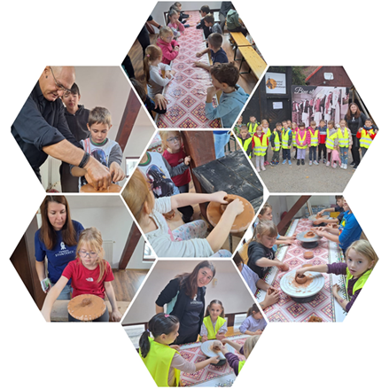 ATELIERUL 5: ”Despre timp și patrimoniul local ” În cadrul atelierului, elevii au aflat date istorice legate de construirea ceasului floral din Centrul Timișoarei-simbol arhitectural al Timișoarei anilor 1990 apoi au vizitat ceasul floral unde au desfășurat jocuri de mișcare și activități de tip joc în cadrul cărora elevii au învățat să citească ora, apoi au vizitat Muzeul Satului Bănățean unde au manipulat roata olarului, construind vase de lut.